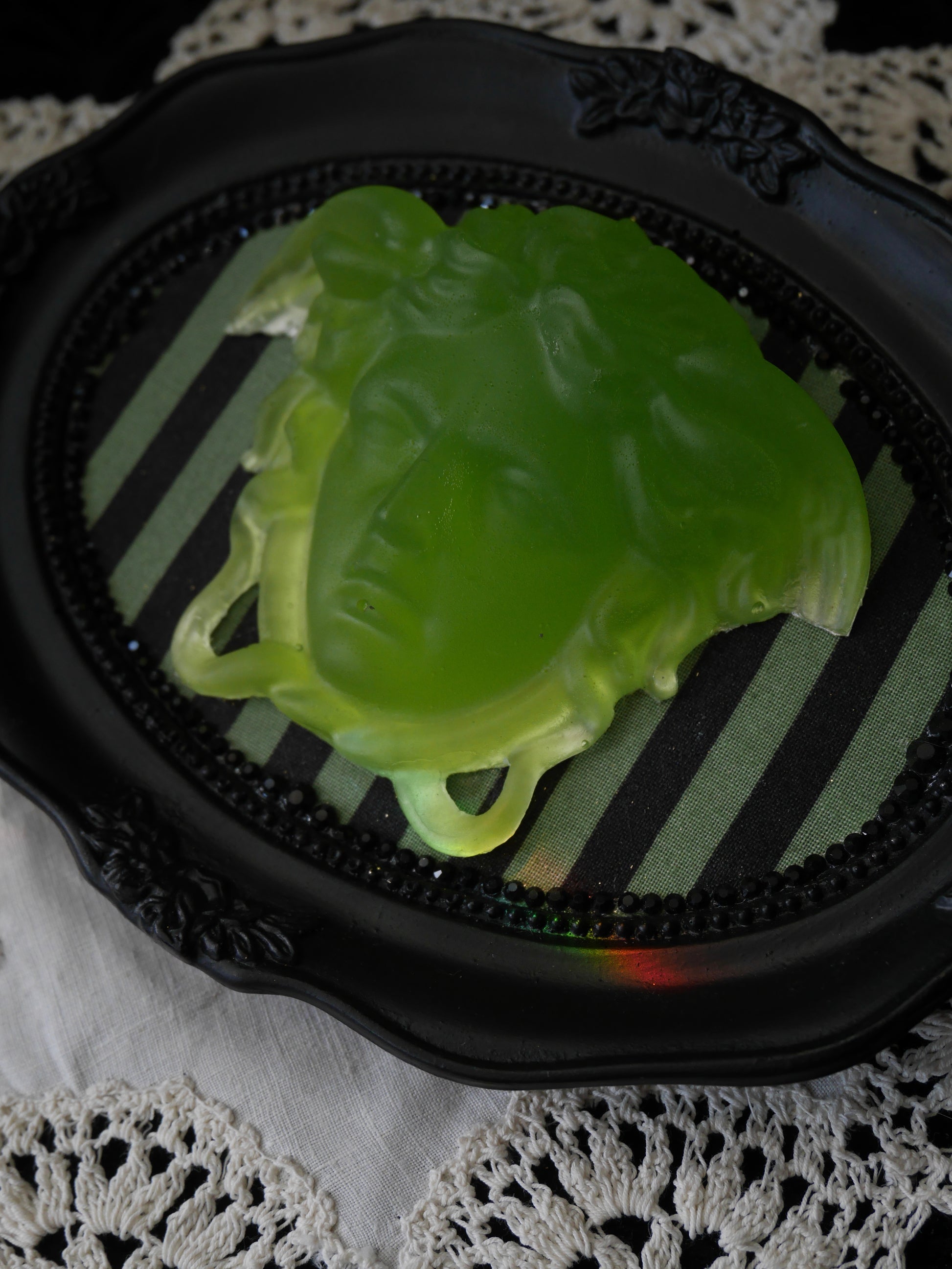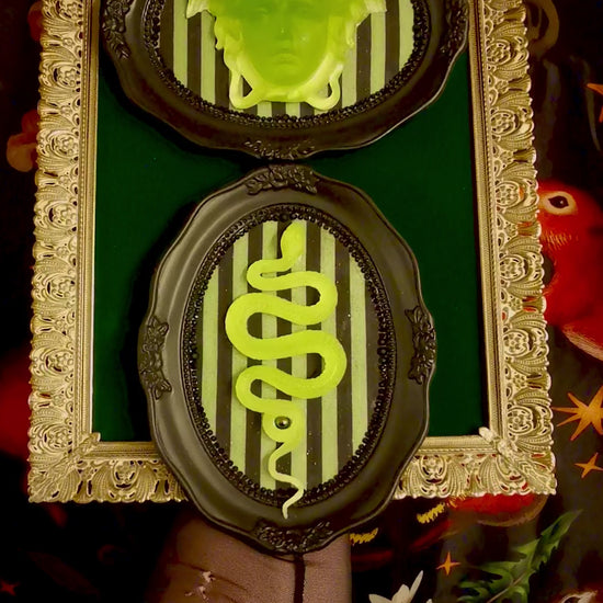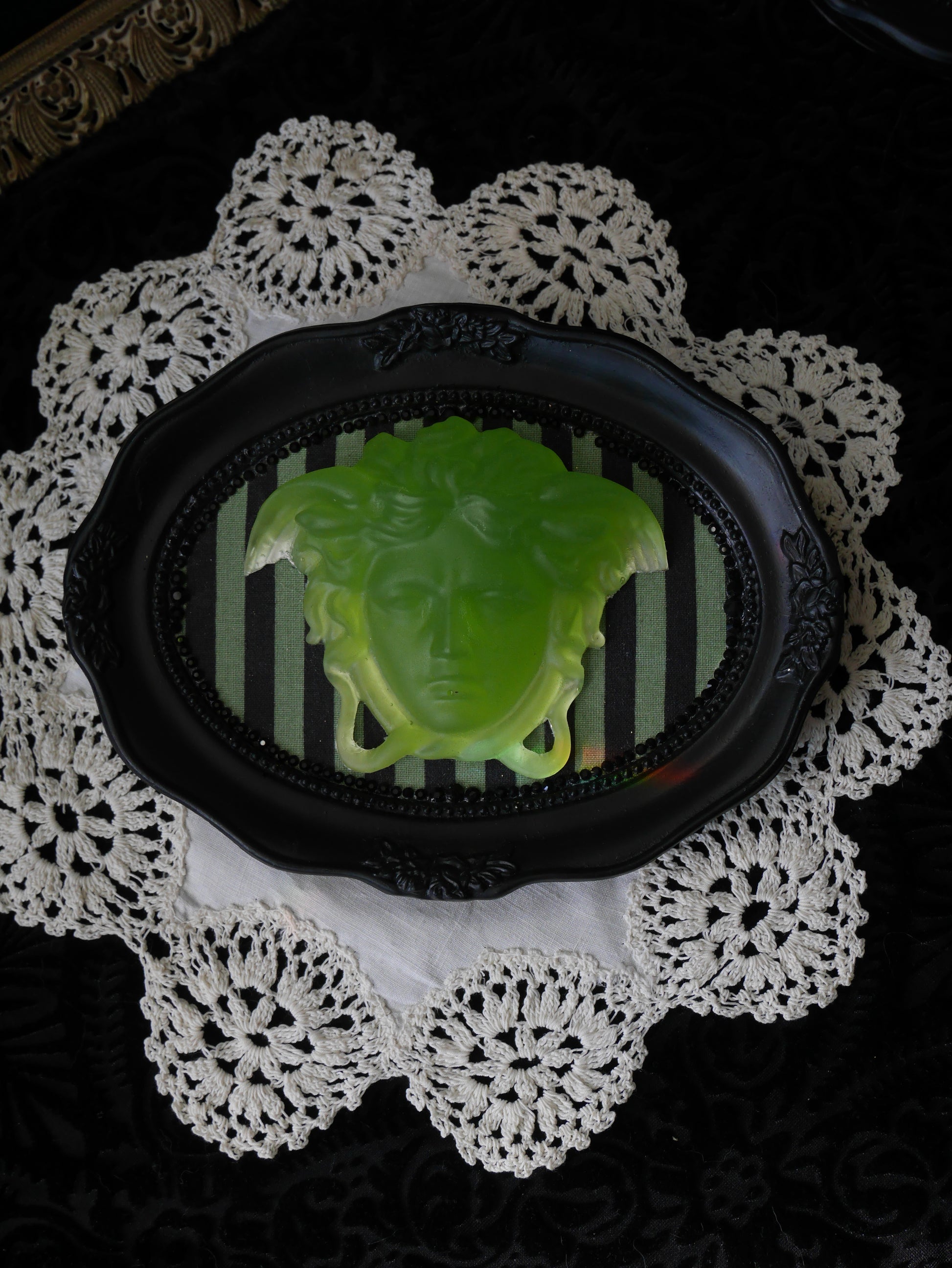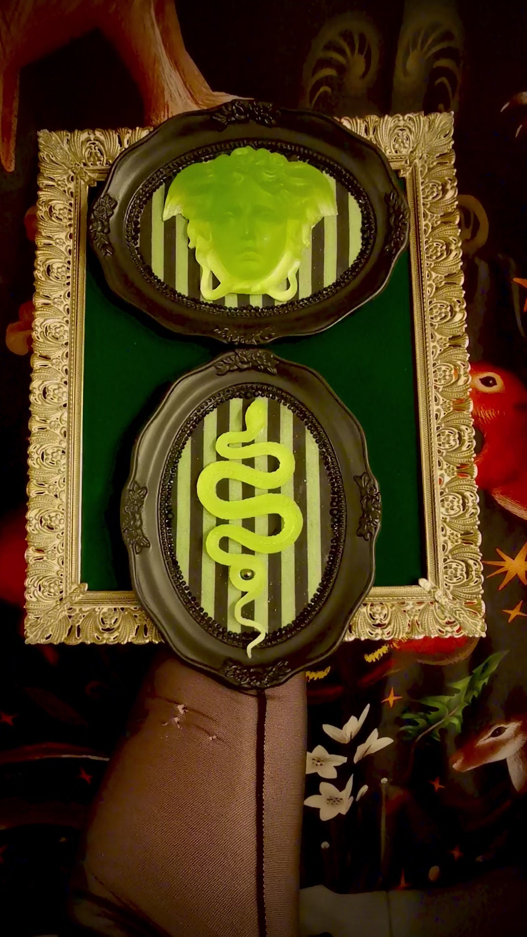 Meet the Medusa set, inspired by haunted houses and uranium glass. Each sculpture is cast in translucent resin, glow in the dark pigment & backed by mirror to catch the light. They sit on lightly sparkly green & black fabric and encircled by black rhinestones and set in oval frames. These pieces will charge in solar light and are black light reactive!