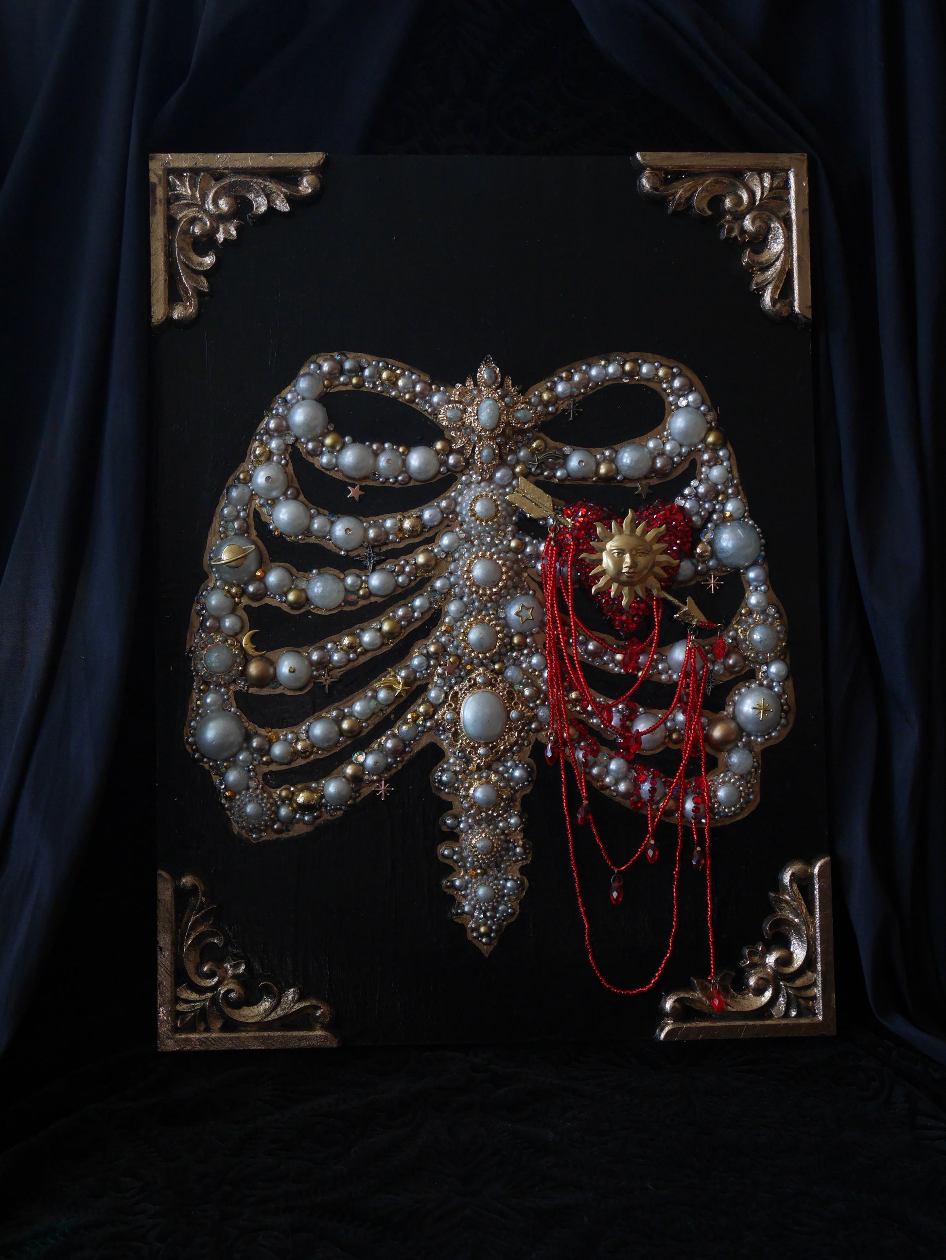 This piece holds countless hours of work hunched over casting many of the details and jewels myself or adhering them to their form, painting around details, getting gilding flakes absolutely every where one could imagine. (Some even came with me on a trip to Saint John to forever haunt our B&B room 😆), pearls, rhinestones, and celestial charms compose this ribcage with a sun bursting encrusted heart, pierced by a gold arrow. Glass & crystal beads cascade down the ribcage in luxurious fragility.
